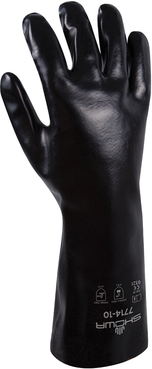 - With a cotton-lined PVC construction and smooth grip combined with a 14" gauntlet, SHOWA 7712R provides defensive protection from chemicals, oils and grease, perfect for any and all general-purpose industrial applications.