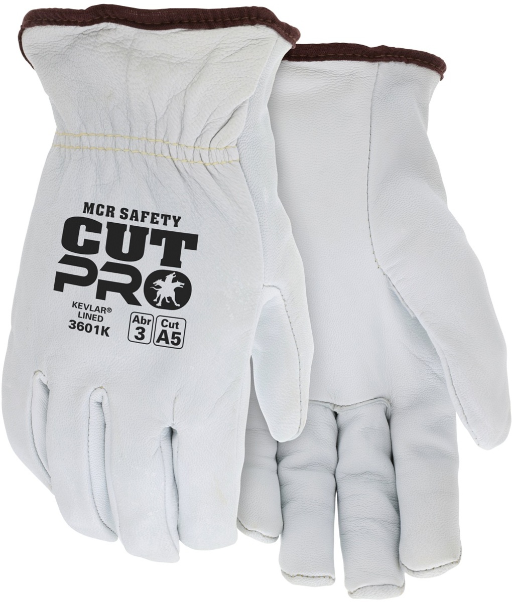 This supple leather contains natural lanolin that helps create a very soft feel. Characteristics include strongest tensile strength and excellent tactile sensitivity. Best combination of flexibility and comfort. The 3601K series features premium grade grain goatskin leather, 13 gauge DuPont™ Kevlar® Liner, shirred elastic back, and straight thumb.