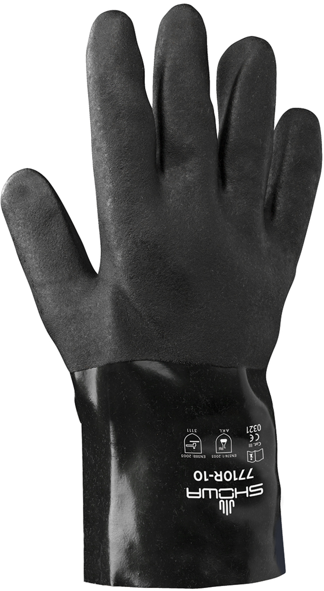 - With a cotton-lined PVC construction and rough grip combined with a 10" gauntlet, SHOWA 7710R provides defensive protection from chemicals, oils and grease, perfect for any and all general-purpose industrial applications.