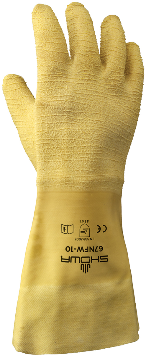 The industry's first wrinkle-finished natural rubber-coated glove the SHOWA 67NFW features a 14" gauntlet and is fully-coated rough grip.