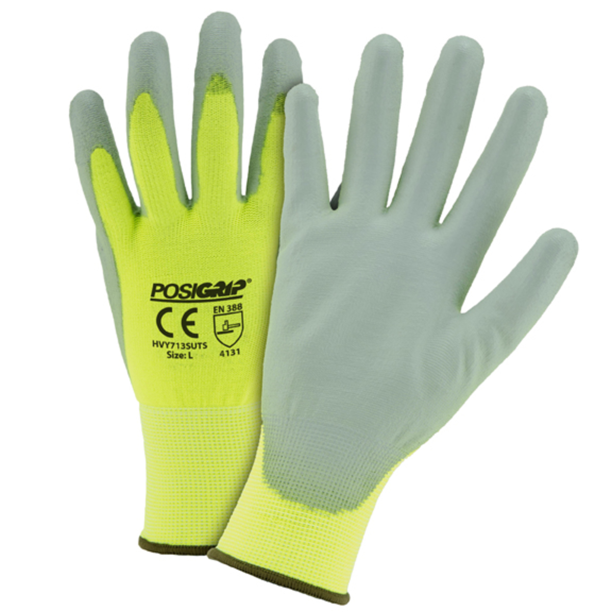 Protective Industrial Products Medium G-Tek® PosiGrip® 13 Gauge Gray Polyurethane Palm And Finger Coated Work Gloves With Hi-Viz Yellow Polyester And Spandex Liner And Knit Wrist