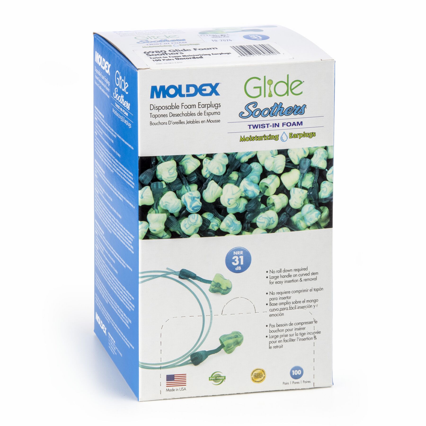 Glide Soothers Foam Twist-In without Cord. EASE OF INSERTION. Glide Foam's unique multi-curved stem rotates for a custom fit inside each ear canal. With its unique curved stem design, you simply push and twist for Glide to angle its way to find your fit. HIGH INDEPENDENTLY RATED NRR. Glide Soothers Foam features a high NRR 31dB which is among the highest independent ratings for a no roll style plug. All Moldex hearing protection is independently tested to ANSI S3.19-1974 by Michael and Associates, Inc., State College, PA