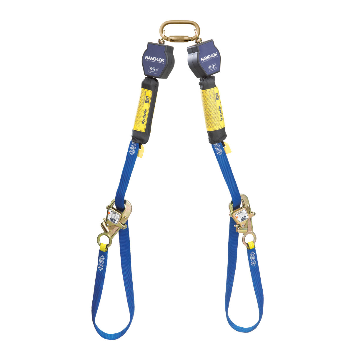 3M™ DBI-SALA® Nano-Lok™ 9 ft. (2.7m) twin-leg tie-back type with 3/4" (19mm) Dyneema® fiber and polyester web and tie-back hook, quick connector for harness (fixed D-ring) mounting.