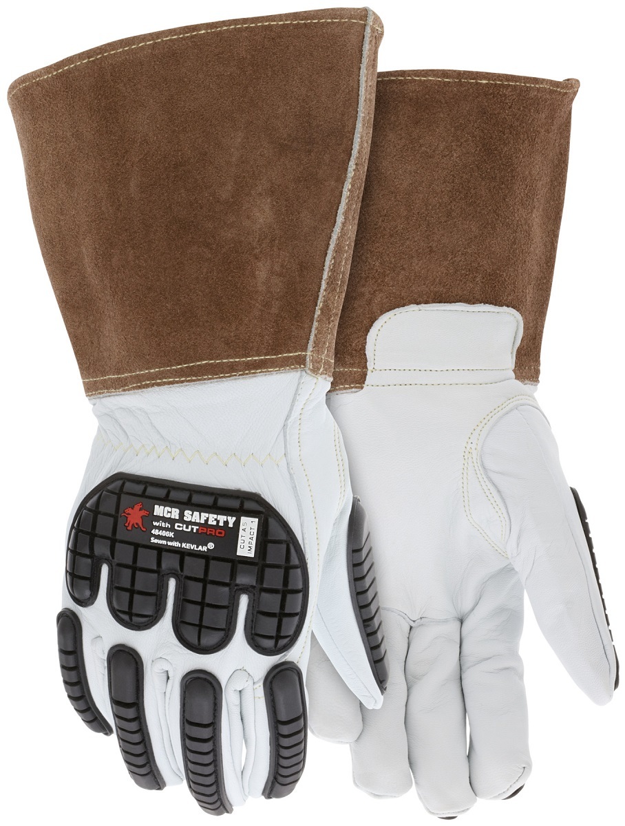 This MCR Safety Welding option is made of premium grain goatskin. This supple leather contains natural lanolin that helps create a very soft feel. Characteristics include strongest tensile strength and excellent tactile sensitivity. Best combination of flexibility and comfort. The 48406K MIG/TIG glove has a 5 inch russet split cow-skin cuff for additional safety and is lined with DuPont Kevlar® for additional heat and cut protection. It is also sewn with DuPont Kevlar®, has a keystone thumb and a self-hem sewn cuff. The TPR back offers excellent impact resistance on the fingers and back of the hand.