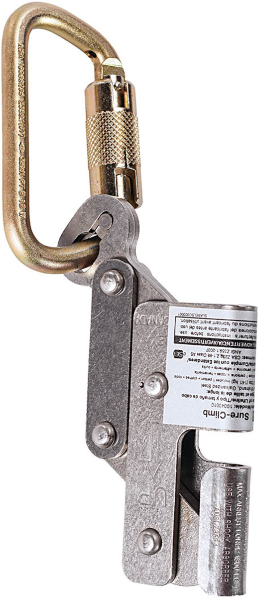 MSA SureClimb® Stainless Steel Slider Fall Arrester offers a fall protection up to 300' in height when climbing or descending ladders or vertical structures. Sure-Climb™ slider featured with carabiner works well with both temporary and permanent cable systems.