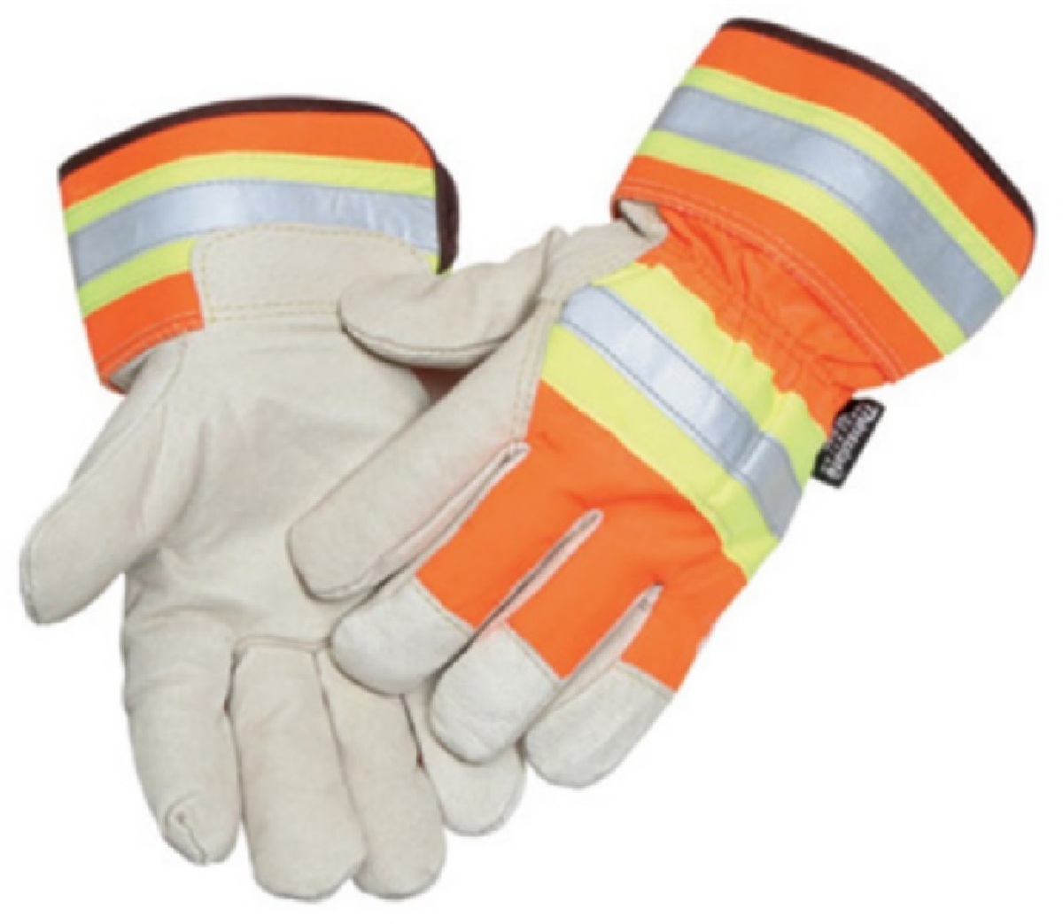 RADNOR premium grain pigskin gloves have a wing thumb and are lined with Thinsulate for warmth without the bulk. The fluorescent orange polyester back has a 2.2" green band has a 3/4" strip of 3M® Scotchlite reflective silver fabric while the 2 1/2" rubberized safety cuff has a 1 1/2" wide green band and a 3/4" reflective stripe.