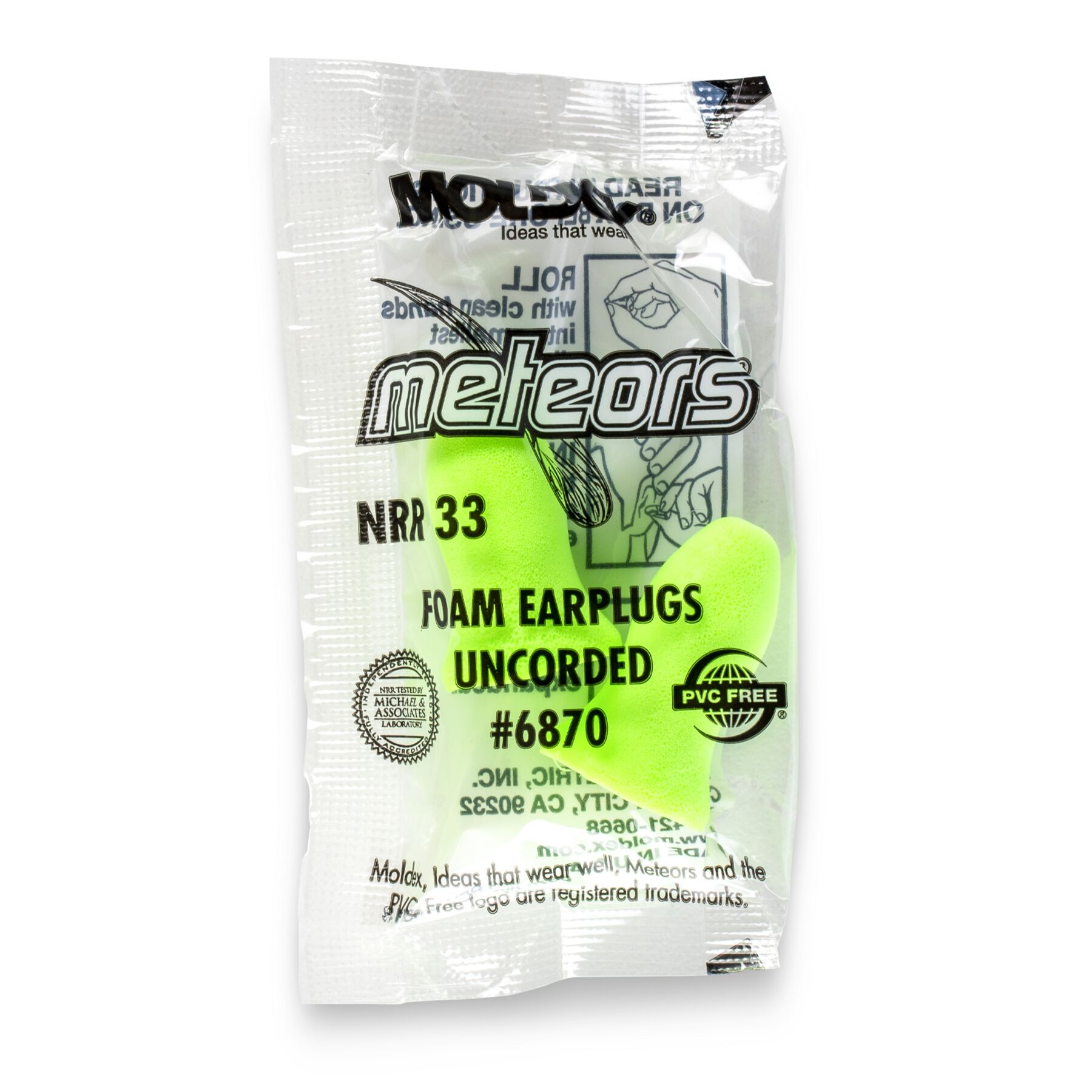 Moldex® Meteors® Uncorded Earplugs feature a curved shape which fits smaller ear canals and have smaller diameters that exert less pressure. Earplugs feature an undercut design for a secure fit and the big base helps in proper insertion and removal. Plugs are made from soft, slow recovery foam and the noise reduction is rated at 33 dB.