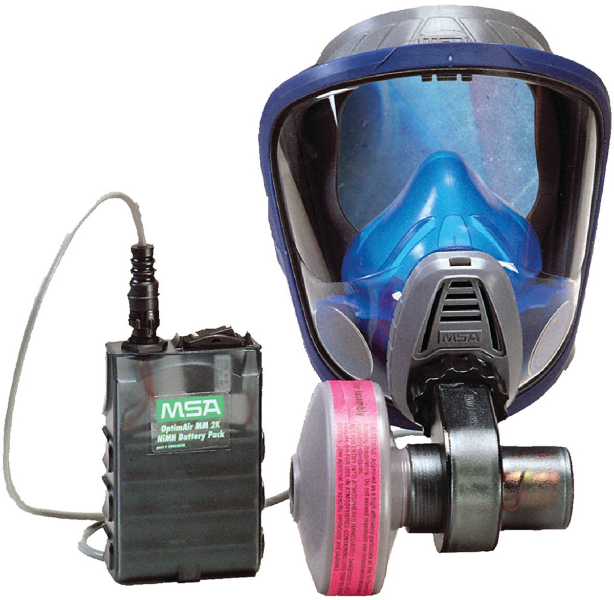 MSA OptimAir® Small Black Hycar Rubber Mask-Mounted PAPR Assembly with Advantage® 4100 facepiece is ideal for use within hazardous particulate environments including asbestos, lead abatement, nuclear and mold remediation applications. Water-resistant HEPA filter for protection against particulate contaminants and it has sealed, water-resistant battery fits inside most pockets. Dual-rate charger recharges fully discharged battery in less than 3 hrs. It features lightweight and compact design for long-life, high-performance and low maintenance. It includes rubber head harness, motor, NiMH battery, charger, cable, HE filter cartridge and waist belt.