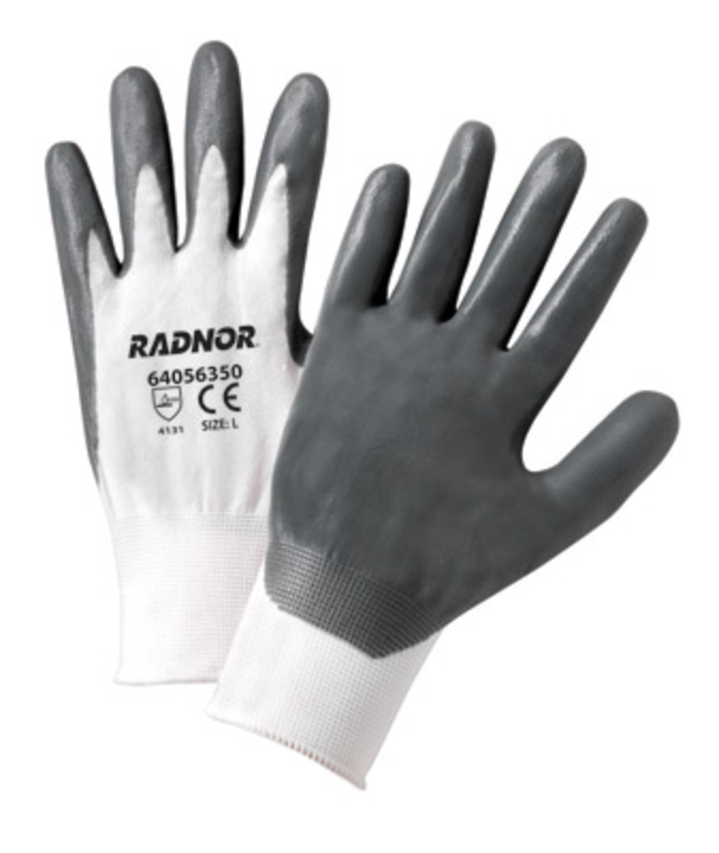 RADNOR™ 13 Gauge Gray Nitrile Laminated Fully Coated Work Gloves With White Nylon Liner And Knit Wrist.