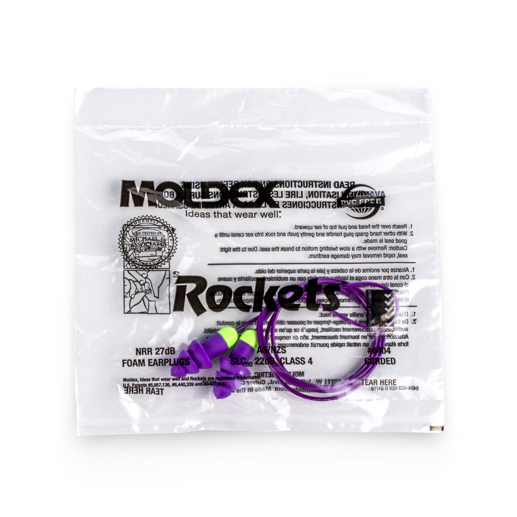 Rockets® Reusable Earplugs Uncorded, NRR 27. Rockets reusable earplugs are designed to give you a great grip. The easy grip handle lets them easily slip into the ear. Rockets features an air bubble in the tip providing cushioned comfort and a triple flange design that provides maximum comfort for all day wear. The soft flexible flanges provide a superior seal and fit most ear canals. Rockets earplugs can be washed and reused. Each pair comes with a Pocket-Pak carrying case to keep them clean when not in use. The smooth shape slides easily into your pocket. All Moldex hearing protection is independently tested to ANSI S3.19-1974 by Michael and Associates, Inc., State College, PA.