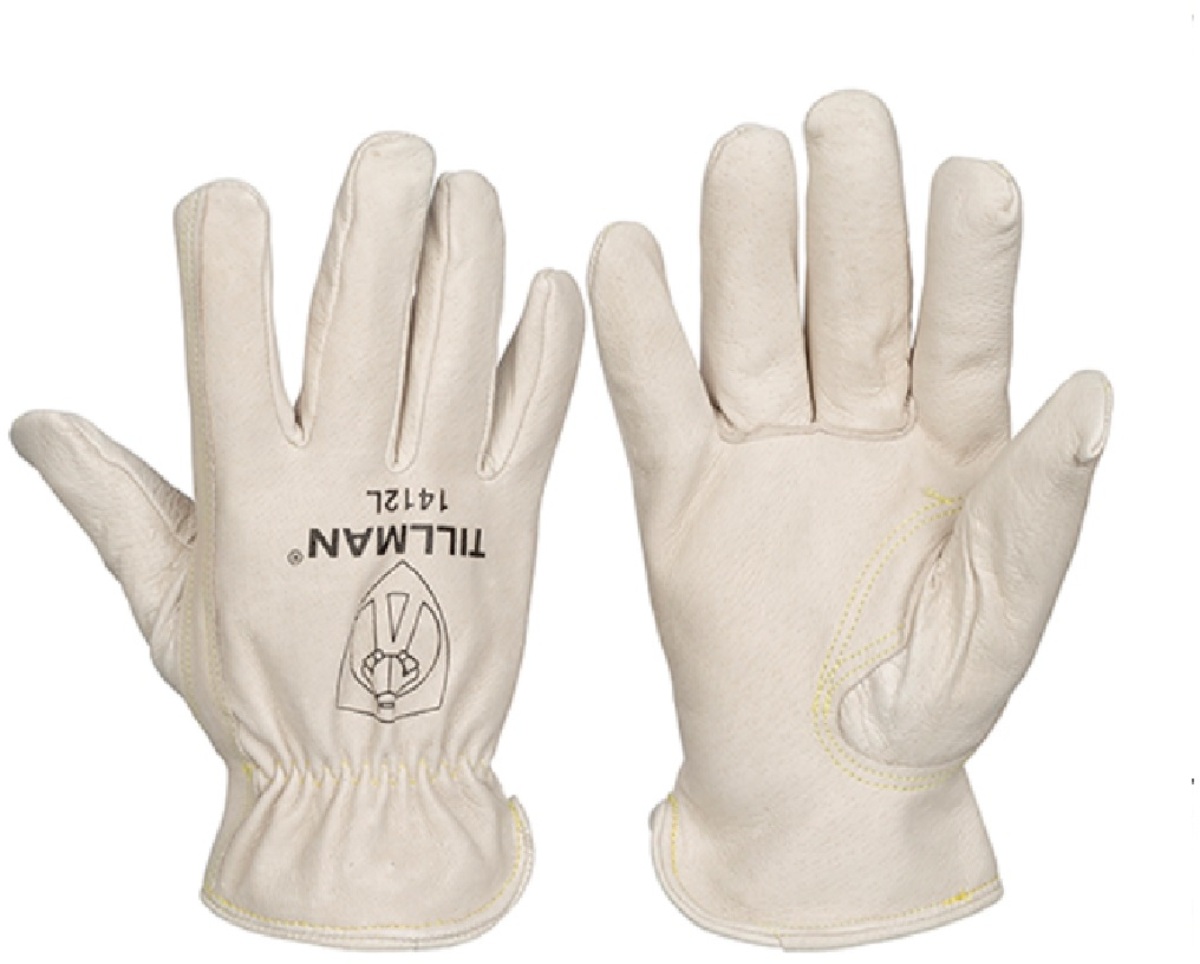 The TillmanĀ® 1412 Series drivers gloves feature premium, pearl white top grain pigskin leather that offers natural resistance to oil and liquid keeping the wearer's hands dry while delivering unmatched comfort. The glove features a fleece lining for increased warmth. A shirred wrist helps the glove stay in place and keep debris out. The forefinger is double stitched which provides extra strength and durability and a gunn cut with a keystone thumb allows for easy movement and greater dexterity. Size Medium.