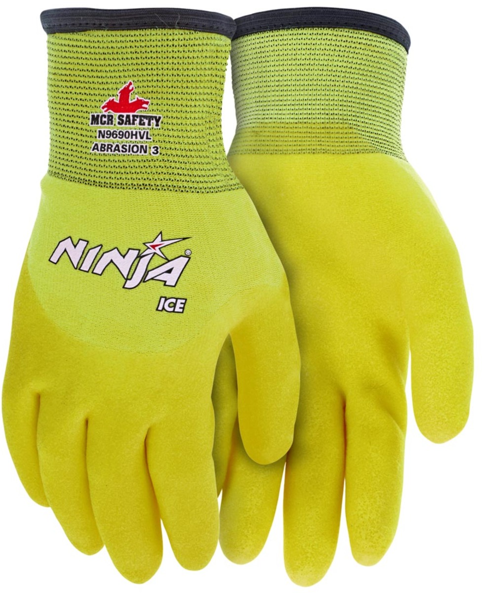 MCR Safety Ninja® Ice Large HPT Coated Double Layer Hi-Viz Gloves feature 7 ga inside acrylic terry liner and a yellow Hi-Viz is 15 ga nylon liner with HPT outside coating offers immense combination of dexterity, sense of touch and protection. PVC foam sponge gloves remain soft and flexible in temperatures as low as 50 deg C and HPT coating repel liquids while providing a firm wet or dry grip. Actifresh treated gloves will kill bacteria and promote freshness with enhanced durability. Work gloves find application in commercial fishing, construction, outdoor winter use and in cold storage.