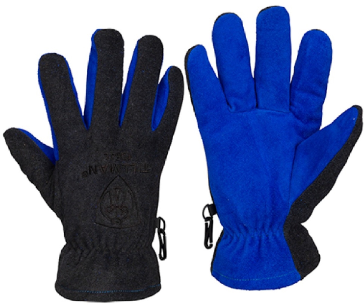 The Tillman® 1564 Series cold weather work gloves feature a split cowhide blue leather palm and black fleece back. The ColdBlock poly/cotton liner keeps hands warm during tough cold weather jobs. A shirred elastic wrist helps keep cold debris out. The convenient clip keeps the glove pair together when not in use and can be attached to a belt for quick access. Size Medium.