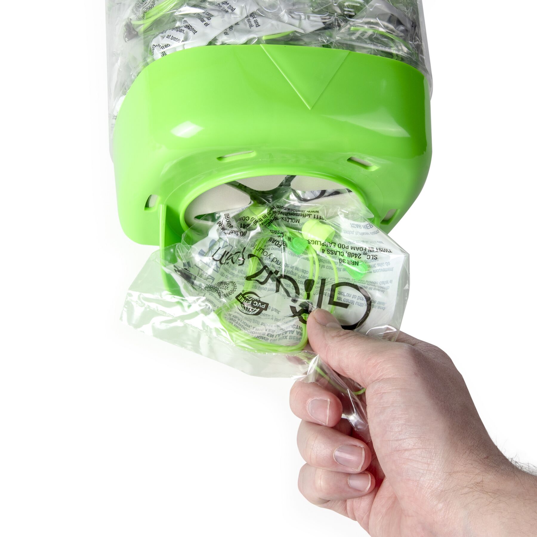 Moldex® Glide® Plugstation® Corded Earplug Dispenser contains 150 pairs of individually packaged Twist in Foam Earplugs that feature a distinct multi-curved stem that rotates for a custom fit inside each ear canal and the big handle on the stem makes insertion easy. Earplugs have a soft foam pod for a snug seal and fit. The cord can be attached to any length.