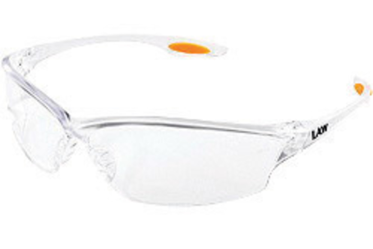 MCR Safety® Law® 2 Safety Glasses with single clear lens has thermal plastic rubber temple inserts and nose pads that improves grip and comfort. Rugged polycarbonate lens with integral side shields offers greater orbital seal and filters 99.9% of harmful U.V. rays. Dielectric glasses with 90% VLT feature clear bayonet temple with orange colored sleeve. It comes with a wrap-around lens design that renders an optimum orbital seal and a higher level of protection from side impacts due to its greater coverage area. It meets ANSI Z87, AS/NZS 1337.1,CAN/CSA Z94.3 standards.